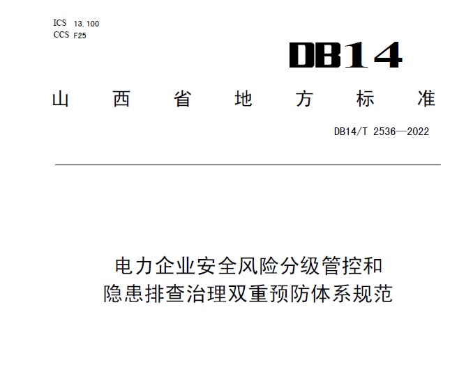 2022年,研究院起草編寫的山西省地方標(biāo)準(zhǔn)《電力企業(yè)安全風(fēng)險分級管控和隱患排查治理雙重預(yù)防體系規(guī)范》正式發(fā)布實施,該標(biāo)準(zhǔn)是全國首個面向電力行業(yè)所有企業(yè)的通用性雙重預(yù)防體系建設(shè)、運行省級地方標(biāo)準(zhǔn)。將風(fēng)險管控和隱患排查工作一體化,并與電力企業(yè)原有安全管理方法有機融合,構(gòu)建了明確的風(fēng)險分級管控責(zé)任體系。