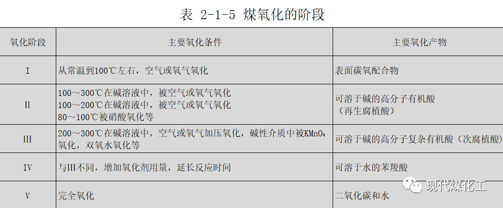 通常將第I階段稱為表面氧化階段,第Ⅱ階段叫再生腐植酸階段,第Ⅲ、第IV階段叫苯羧酸階段。到第Ⅱ階段為止稱輕度氧化,一直進(jìn)行到第Ⅳ階段則稱深度氧化。氧化的第V階段,即燃燒,它與煤作為燃料的反應(yīng)性有關(guān)。