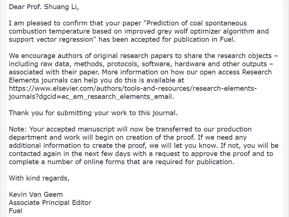 該研究《Prediction of coal spontaneous combustion temperature based on improved grey wolf optimizer algorithm and support vector regression 》被能源領(lǐng)域頂級期刊Fuel錄用。Fuel是國際公認(rèn)的能源領(lǐng)域頂級期刊,主要發(fā)表能源和燃料方面的原創(chuàng)性研究成果,最新影響因子8.035,中科院最新SCI分區(qū)顯示該期刊為工程技術(shù)類1區(qū)TOP期刊。