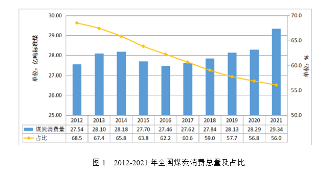 我國(guó)能源稟賦呈現(xiàn)“富煤、貧油、少氣”的特點(diǎn),以煤為主的能源結(jié)構(gòu)短期內(nèi)難以根本改變[1]。過(guò)去10年,煤炭消費(fèi)量占一次能源消費(fèi)比重下降了12.5個(gè)百分點(diǎn),但2021年煤炭消費(fèi)量仍占能源消費(fèi)總量的56%(見(jiàn)圖1)。煤炭作為我國(guó)主體能源,需要按照綠色低碳的發(fā)展方向,對(duì)標(biāo)實(shí)現(xiàn)碳達(dá)峰、碳中和目標(biāo)任務(wù),立足國(guó)情、控制總量、兜住底線(xiàn),有序減量替代,推進(jìn)煤炭產(chǎn)業(yè)轉(zhuǎn)型升級(jí)。煤礦智能化是實(shí)現(xiàn)煤炭產(chǎn)業(yè)轉(zhuǎn)型升級(jí)和高質(zhì)量發(fā)展的核心技術(shù)支撐。近年來(lái),我國(guó)煤礦智能化建設(shè)呈現(xiàn)加速推進(jìn)的態(tài)勢(shì),但部分企業(yè)、部分煤礦智能化面臨推進(jìn)難、推進(jìn)慢等局面。因此,客觀(guān)分析煤礦智能化建設(shè)現(xiàn)狀,找出煤礦智能化建設(shè)中存在的問(wèn)題,制定推進(jìn)煤礦智能化建設(shè)高質(zhì)量發(fā)展的措施建議,對(duì)于實(shí)現(xiàn)煤炭產(chǎn)業(yè)轉(zhuǎn)型升級(jí)具有重要意義。