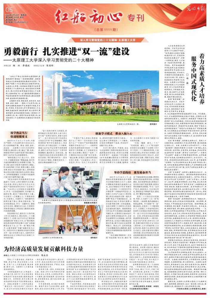 2月23日,《光明日?qǐng)?bào)》“紅船初心”??嫱瞥鎏砉ご髮W(xué)深入學(xué)習(xí)貫徹黨的二十大精神的相關(guān)報(bào)道,以《著力高素質(zhì)人才培養(yǎng) 服務(wù)中國式現(xiàn)代化》《勇毅前行 扎實(shí)推進(jìn)“雙一流”建設(shè)——太原理工大學(xué)深入學(xué)習(xí)貫徹黨的二十大精神》《為經(jīng)濟(jì)高質(zhì)量發(fā)展貢獻(xiàn)科技力量》三篇文章,展現(xiàn)太原理工大學(xué)以實(shí)際行動(dòng)貫徹落實(shí)黨的二十大精神,在推動(dòng)“雙一流”建設(shè)高質(zhì)量發(fā)展中奮進(jìn)新征程、建功新時(shí)代的磅礴力量。