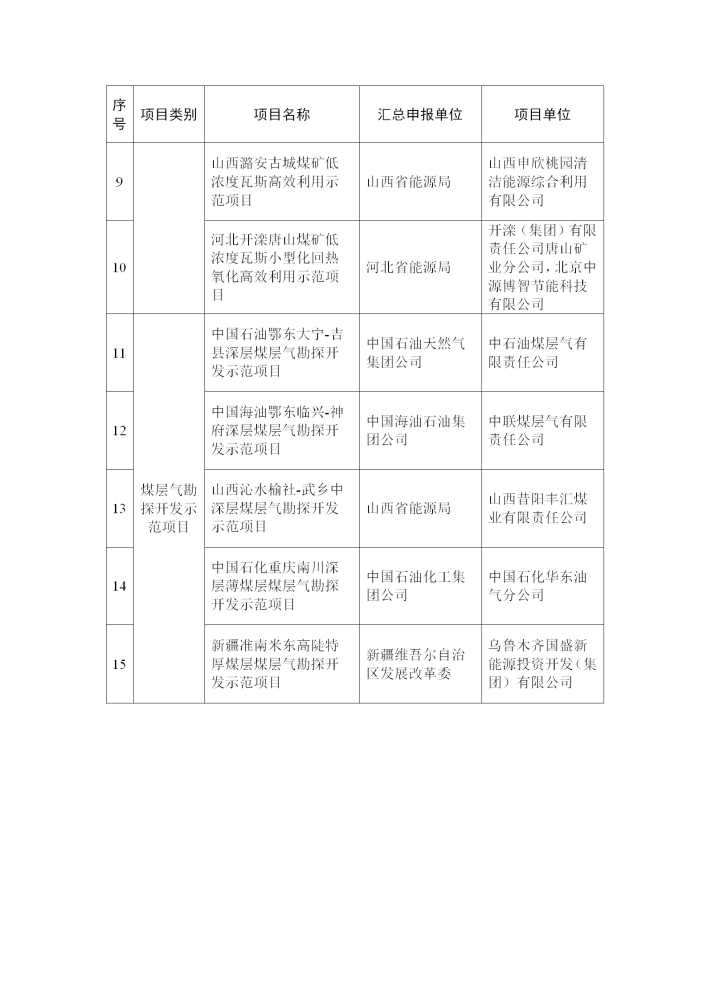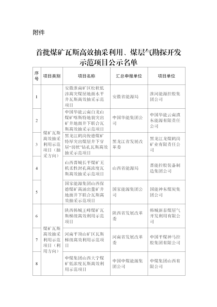 附件:首批煤礦瓦斯高效抽采利用、煤層氣勘探開發(fā)示范項(xiàng)目公示名單