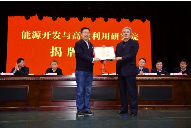 游浩為金智新頒發(fā)了研究院首席科學(xué)家聘書,并與太原理工大學(xué)黨委書記吳玉程共同為能源開發(fā)與高效利用研究院揭牌。