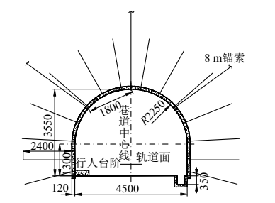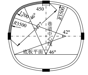 通過表1可知,中央輔運大巷巷道整體松動圈的范圍較大,多數(shù)地點均接近或超過了1.8m,屬于大松動圈范圍,而在原支護中,巷道頂幫錨桿支護的范圍最大為2.4m,再加上施工中存在錨桿錨索支護不到位的情況,導致很多錨桿應有的支護效用不能發(fā)揮出來,這也是在現(xiàn)場勘查中得到很多錨桿被拉伸出來的原因,這說明原設計中錨桿支護已經失效。 (3)巷道圍巖性質影響 中央輔運大巷巷道圍巖所處的層位的圍巖是粉砂巖,從地質資料和現(xiàn)場勘查情況來看,圍巖裂隙發(fā)育明顯,同時,其中含有厚度為0.25m的夾層,夾層的圍巖性質為泥巖,總體的強度較低,且含有膨脹性軟巖成分,在這種情況下,巷道圍巖整體的承載性能較差,在高地應力的作用下,非常容易出現(xiàn)變形破壞。 (4)巷道原支護方式的影響 從中央輔運大巷原有支護設計來看,巷道設計采用的是普通錨梁網索支護,雖然這種支護方式在淺層的巷道圍巖支護中能夠取得較好的支護效果,但是在深部圍巖支護中,已經表現(xiàn)出較強的不適應性,主要是這種支護沒有給深部高應力軟巖留有充足的釋放能量的空間,屬于“剛性支護”,這種剛性支護方式在高地應力作用下,非常容易出現(xiàn)支護失效的情況。再加上巷道原支護中沒有對巷道底板進行支護,導致底板成為了深部高應力釋放的主要空間,這也是本次巷道底板出現(xiàn)變形破壞較大的原因。 (5)地下水影響明顯 從現(xiàn)場勘查情況來看,巷道下部有明顯的水體侵蝕的影響,特別是底板圍巖在長期與水接觸的情況下,自身的承載能力與強度會明顯降低,特別是圍巖中的膨脹性軟巖成分,在水體的作用下,會出現(xiàn)崩解,加劇了巷道圍巖變形。 3、中央輔運大巷返修支護設計分析 結合中央輔運大巷出現(xiàn)的變形破壞特征及具體機理,本次返修設計采用“錨網索+U型鋼閉合環(huán)+底板注漿”聯(lián)合支護方案。 3.1返修方案支護機理 首先,U型鋼閉合環(huán)設計采4節(jié)U型鋼組合形成一個完整的U型鋼支護閉合體,這4節(jié)U型鋼的接口位置,設置使用卡纜,目的是實現(xiàn)支架可縮量的自動調節(jié),這對于支架在支護時,更好適應巷道圍巖變形,在巷道圍巖變形過程中,仍舊給予巷道高支護力是非常關鍵的。特別是對于中央輔運大巷巷道整體圍巖變形量較大,選擇使用U型鋼支護閉合支護體,可以為巷道支護提供較高的支護承載能力,隨著支架變形量的增加,其支護阻力也隨著增加,實現(xiàn)“高阻讓壓”支護,這對于深部巷道支護是非常關鍵的,有效避免了傳統(tǒng)剛性支護的弊端。 其次,錨網索支護主要仍舊是在巷道的頂?shù)装寮皟蓭蛯嵤└邚姸儒^桿、錨索支護,同時,對錨索、錨桿施加高強度預緊力,最大限度的提升對巷道表層圍巖的預緊壓縮效果,實現(xiàn)對巷道淺層圍巖的變形限制。同時,本次設計在巷道兩幫打設長度為4200mm,直徑為17.8的預應力錨索,更好發(fā)揮錨索對巷道兩幫圍巖的支護作用,調動巷道兩幫深部穩(wěn)定圍巖對淺部圍巖變形的限制作用。從而在巷道淺層形成錨桿+錨索+鋼筋網+托盤+巷道圍巖為一體支護結構,充分調動巷道淺部圍巖、中深部圍巖對巷道整體變形的限制作用。 第三,巷道底板注漿支護??紤]到中央輔運大巷下步涌水嚴重的情況,本次設計在巷道底板打設注漿管道,實現(xiàn)對巷道底板及巷道兩幫下部裂隙的有效封堵,提升巷道底板的承載能力,限制巷道底板及兩幫圍巖變形。 3.2具體支護方案設計 本次設計的具體支護方案為: (1)U型鋼閉合環(huán)支護設計。本次U型鋼閉合環(huán)設計采用U28型鋼,設計的有效壓縮量為400mm,4節(jié)U型鋼搭接而成,每節(jié)的長度為4400mm,具體見圖3所示。