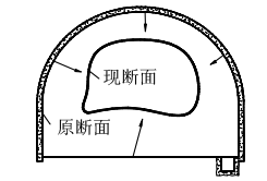 圖1 中央輔運大巷原支護設計圖 Fig. 1 Design drawing of original support for North track roadway 2、中央輔運大巷變形破壞特征及機理分析 為準確掌握中央輔運大巷變形破壞特征,采取針對性的圍巖控制措施,對中央輔運大巷變形破壞特征及機理進行了現(xiàn)場勘查。 2.1變形破壞特征 根據現(xiàn)場勘查發(fā)現(xiàn),中央輔運大巷出現(xiàn)了全斷面變形破壞。巷道底板鼓起量在1.4m—1.7m之間,巷道頂板下沉量在1.1m—1.3m之間,頂?shù)装迤骄鄬σ平吭?.5m—2.9m之間。巷道兩幫相對移近量接近2.2m。同時,在現(xiàn)場勘查時發(fā)現(xiàn),巷道下部有明顯的涌水情況,兩幫圍巖出現(xiàn)了顯著的遇水軟化特征,且巷道原支護體上形成了較多網兜。巷道的兩幫和頂板處出現(xiàn)了較多的錨桿整體外移的情況,這表明巷道錨桿支護已經失效,支護體已經被拉斷。巷道在變形前后的斷面圖見圖2所示。