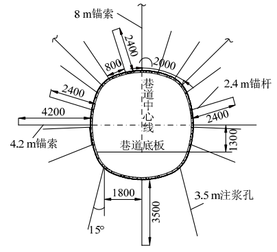圖3 U型鋼閉合環(huán)支護體支護示意圖 Fig. 3 U-shaped Steel closed ring support sketch (2)錨網索支護設計。錨桿支護設計參數(shù)為:φ22mm×2400mm,間排距為800mm×800mm。幫錨索支護參數(shù)為:φ17.8mm×4200mm,位置在距離底板1200mm處,對稱布置兩根。頂板錨索使用φ17.8mm×8000mm,對稱布置三根,間排距為1600mm×1600mm。其中設計錨桿的預緊力均為65kN,錨索的預緊力均為75kN。 (3)底板注漿參數(shù)設計。為了擴大底板注漿支護效果,本次注漿對稱布置三根注漿孔,注漿壓力控制在5MPa左右,注漿角度設計外擺15°,間排距設計為1800mm×1800mm。 巷道錨網索支護和底板注漿支護設計見圖4所示。