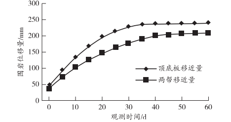 圖4 巷道錨網索+注漿支護示意圖 Fig. 4 Diagram of bolt-mesh-cable+grouting support in Roadway 3.3返修后支護效果分析 為了驗證本次返修后支護效果,選擇使用十字布點法對巷道圍巖變形情況進行了監(jiān)測分析,通過觀測,得到了巷道圍巖變形曲線,見圖5所示。