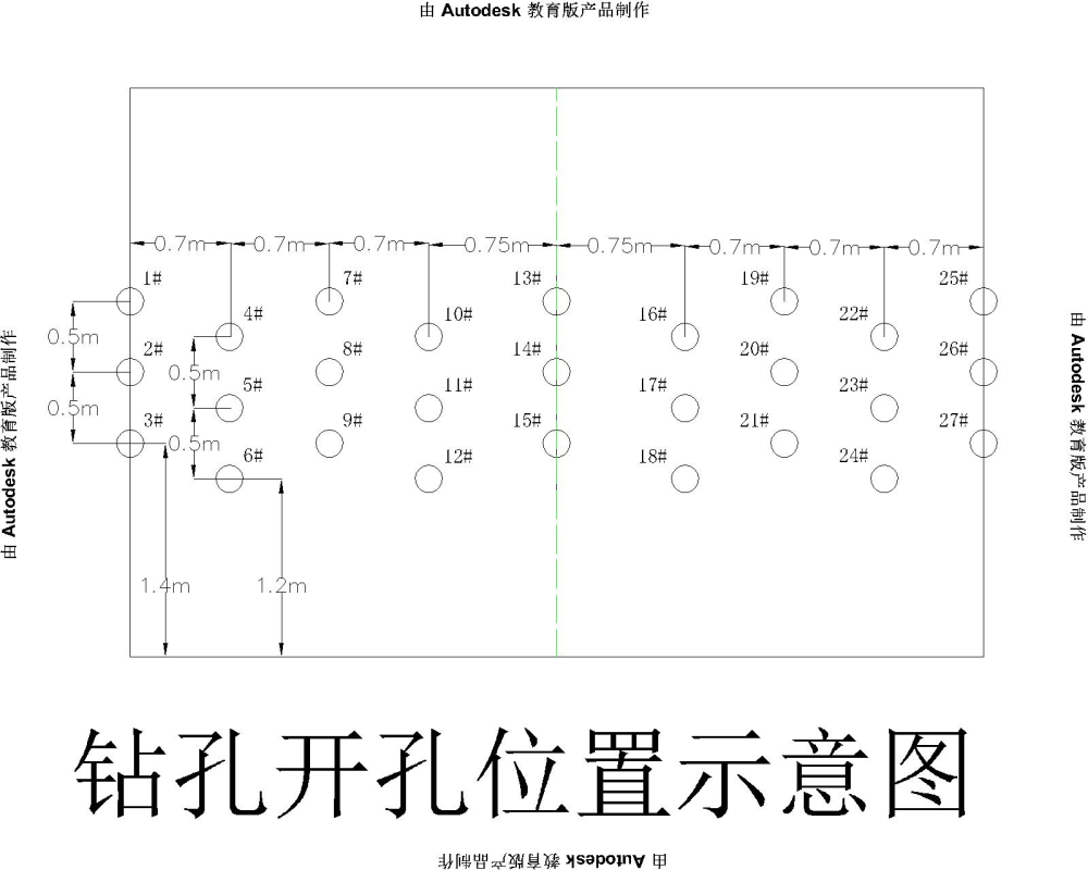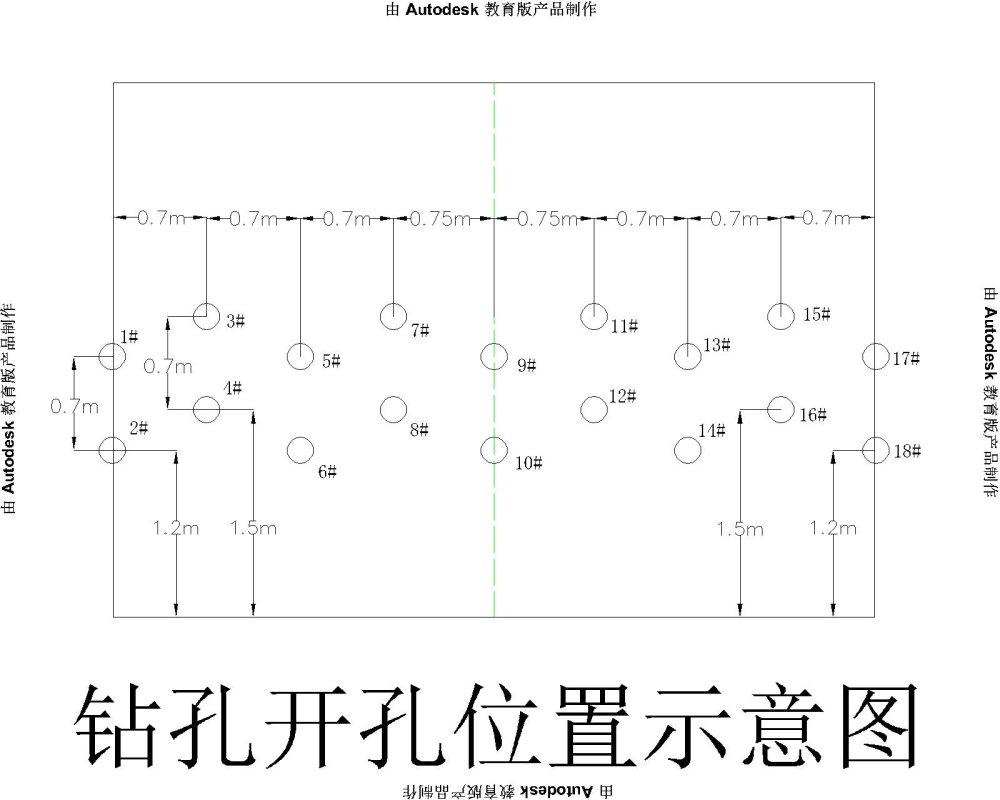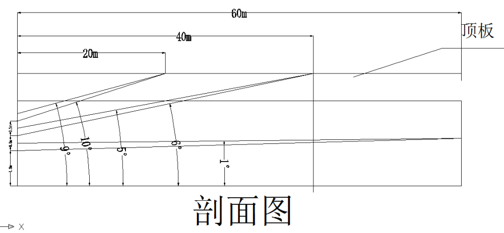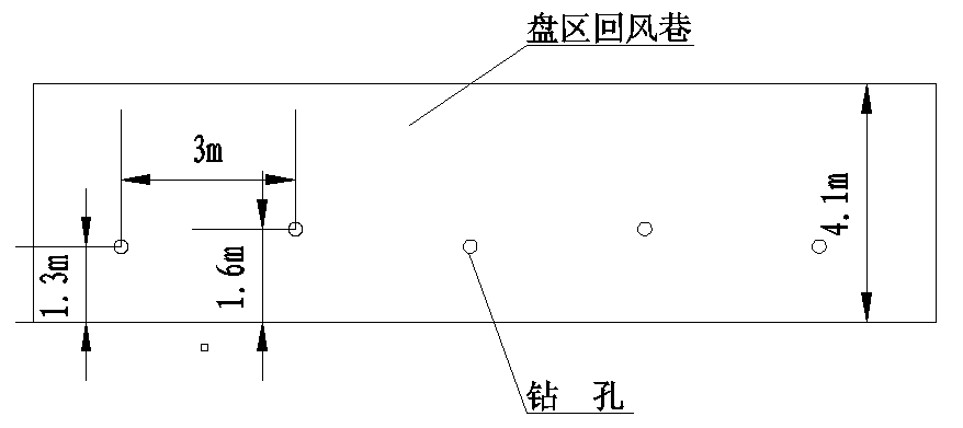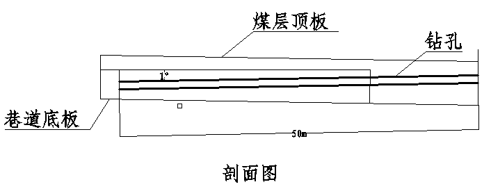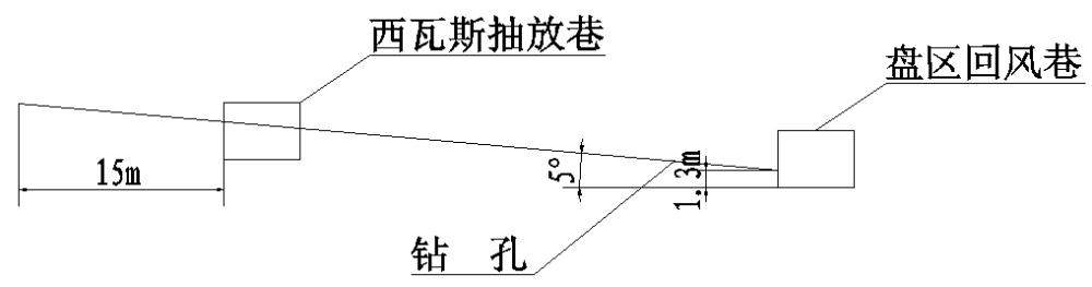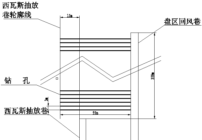 圖2 西瓦斯抽放巷鉆孔開(kāi)孔位置示意圖 3.3.2 區(qū)域措施效果檢驗(yàn)及工作面掘進(jìn) 在西瓦斯抽放巷掘進(jìn)過(guò)程中連續(xù)執(zhí)行,強(qiáng)化抽采方案每循環(huán)覆蓋巷道前方60m。預(yù)留20米超前距,每循環(huán)允許掘進(jìn)距離分別為40m。 現(xiàn)場(chǎng)實(shí)測(cè)時(shí)嚴(yán)格執(zhí)行《防突細(xì)則》要求,區(qū)域布置檢測(cè)點(diǎn)5個(gè),分別位于巷道正前方20m、40m、60m及巷道左右兩側(cè),當(dāng)實(shí)測(cè)所有測(cè)點(diǎn)殘余瓦斯含量全部降至7m3/t(構(gòu)造帶殘余瓦斯含量小于6m3/t)以下后,工作面方可判定措施有效。 3.4 利用已掘巷道施工鉆孔進(jìn)行補(bǔ)充強(qiáng)化抽采 盤區(qū)回風(fēng)巷超前西瓦斯抽放巷200米,在巷道西幫施工順層鉆孔對(duì)西瓦斯瓦斯抽放巷實(shí)施補(bǔ)充強(qiáng)化抽采。 3.4.1 利用已掘巷道施工鉆孔參數(shù) 鉆孔布置一排,三花眼布置,鉆孔開(kāi)孔間距3m,覆蓋至西瓦斯抽巷西幫輪廓線外15m,具體參數(shù)如下圖3所示。