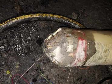 打空心包體孔。利用自備的錐形鉆頭(直徑為127mm,圖4),其上帶有長(zhǎng)360mm,直徑36mm的小鉆頭,打同心小孔并取巖芯,同時(shí)將孔底磨平,并用錐形鉆頭打出70mm長(zhǎng)的喇叭口,小孔深360mm。此小孔一次性打到底,鉆孔過程中,必須利用1m長(zhǎng)巖芯管定向。 沖洗鉆孔。小孔成形后,抽出鉆桿50mm,用鉆機(jī)的水管沖洗。 (2)安裝空心包體 清洗和干燥鉆孔:在洗孔器上纏上棉紗(直徑略大于36mm),倒上丙酮,利用安裝桿將洗孔器送到孔底進(jìn)行鉆孔干燥清洗一至兩遍,并記錄洗孔器進(jìn)入孔底時(shí)鉆桿外露長(zhǎng)度及洗孔器長(zhǎng)度。 配制環(huán)氧膠(圖6)。用注射器和托盤天平嚴(yán)格量取環(huán)氧膠47克,固化劑8.4克,置于燒杯內(nèi),混合均勻。將配制好環(huán)氧膠倒入應(yīng)力計(jì)的空腔,用牙簽固定好柱塞(圖7)。 安裝空心包體。先用砂紙把空心包體表面尤其是應(yīng)變片位置打磨掉1mm左右的厚度,然后在定位器的定位槽中涂抹好黃油,將空心包體安裝到定位器上,確定A應(yīng)變片豎直向上后用安裝桿細(xì)心的將包體送到預(yù)定位置,推斷固定銷牙簽,將環(huán)氧膠從包體內(nèi)腔擠出使空心包體與鉆孔壁膠合。并測(cè)量鉆桿外露長(zhǎng)度,確定牙簽斷掉,環(huán)氧膠已完全擠出。 專人保護(hù)。設(shè)專人看守,防止誤碰外露鉆桿,影響空心包體與巖壁膠合。
