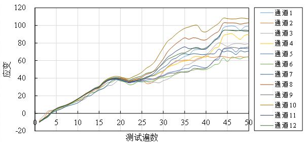 (2)測(cè)量孔的解除曲線在測(cè)量工作中,應(yīng)力解除過程都比較正常,并能取出帶有應(yīng)力計(jì)的完整巖心。應(yīng)力解除完成后根據(jù)應(yīng)變儀的讀數(shù),分布繪制出各測(cè)點(diǎn)的應(yīng)力解除曲線,并由繪制出的應(yīng)力解除曲線得出各個(gè)應(yīng)變的穩(wěn)定應(yīng)變值。 2020年11月10日在通404-2盤區(qū)軌道暗斜井2#煤躲避硐室進(jìn)行了測(cè)量,A應(yīng)變片豎直向上,應(yīng)變片深度為800cm,解除過程中應(yīng)用應(yīng)力計(jì)的12個(gè)應(yīng)變片隨解除距離的應(yīng)變變化曲線詳見應(yīng)力解除曲線(圖12)。 從圖中可以看出,解除開始至解除距離28cm階段,應(yīng)變曲線平緩,應(yīng)變隨解除距離的變化幅度很小,說(shuō)明鉆頭未推進(jìn)至應(yīng)變片位置;當(dāng)解除距離至28cm后,應(yīng)變量逐漸增加,當(dāng)解除至應(yīng)變片位置即解除距離達(dá)30cm時(shí),應(yīng)變量突然增加,隨后應(yīng)變曲線趨于平緩,解除至40cm后,應(yīng)變量基本不變,解除至45cm時(shí),應(yīng)變解除結(jié)束。應(yīng)變解除曲線正常,可作為計(jì)算應(yīng)力的依據(jù)。