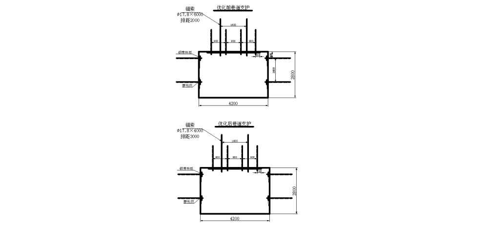 4、優(yōu)化支護(hù)形式 三、主要創(chuàng)新點(diǎn)及結(jié)論通過對(duì)云崗礦原巖應(yīng)力現(xiàn)場(chǎng)測(cè)定,再根據(jù)實(shí)測(cè)結(jié)果對(duì)其進(jìn)行的反演,得到了2#煤測(cè)點(diǎn)處的三維地應(yīng)力狀態(tài)。對(duì)礦井以后的地下工程設(shè)計(jì)和施工有很大的幫助。綜合分析礦區(qū)原巖應(yīng)力測(cè)定研究成果和地應(yīng)力反演結(jié)果,我們得到了以下結(jié)論: (1)通過實(shí)測(cè)得到了云崗礦2#煤測(cè)試區(qū)域地應(yīng)力分布的大小及方向。得出2#煤測(cè)試區(qū)域主應(yīng)力空間分布規(guī)律,確定巷道布置沿最小主應(yīng)力方向平行受力最小,將2#層盤區(qū)主要巷道沿最小主應(yīng)力方向布置,保證了安全生產(chǎn)。 (2)另外,通過直接頂取芯結(jié)果,確定2#層頂板為含礫粗砂巖,較堅(jiān)硬,完整性好。 通過以上兩點(diǎn)結(jié)論,我們優(yōu)化2#層巷道支護(hù),頂板支護(hù)中將原設(shè)計(jì)6m錨索優(yōu)化為4m錨索,排距由原2m兩根擴(kuò)大到3m兩根,錨桿支護(hù)由1.8m改為1.5m,間排距按原設(shè)計(jì),2#層巷道共計(jì)5000m,為云崗礦減少了可觀的成本支出。 四、經(jīng)濟(jì)社會(huì)效益 1、經(jīng)濟(jì)效益 優(yōu)化巷道支護(hù)方面:頂板支護(hù)由原來(lái)的2m排距2根錨索,改為3m排距2根錨索支護(hù),每米巷道節(jié)省4m錨索材料支出,錨索成本9元/m,巷道節(jié)省36元/m; 人工投入方面:云崗礦目前采用“四·六”制作業(yè)方式,依據(jù)目前各掘進(jìn)隊(duì)組單進(jìn)水平能力,每班次可掘進(jìn)進(jìn)尺為6米。支護(hù)優(yōu)化后每班次可節(jié)約5根錨索(按長(zhǎng)度計(jì)算20m),按四人支護(hù)作業(yè),可節(jié)省一半工作量,人均300元工資結(jié)算,每米可節(jié)省人工投入150元。 巷道優(yōu)化設(shè)計(jì)后,每米巷道材料和人工投入共可節(jié)省186元,2#層共計(jì)可減少支出93萬(wàn)元。 考慮優(yōu)化支護(hù)后,掘進(jìn)單進(jìn)由6m加快到8m,預(yù)計(jì)提前7個(gè)月圈出工作面,每月按月產(chǎn)3萬(wàn)噸計(jì)算,可多出煤炭21萬(wàn)噸,噸煤200元計(jì)算,可產(chǎn)生經(jīng)濟(jì)效益4200萬(wàn)元。 2、社會(huì)效益 通過對(duì)云崗礦原巖應(yīng)力現(xiàn)場(chǎng)測(cè)定,分析原巖應(yīng)力方向分布,合理優(yōu)化巷道布置方式及優(yōu)化巷道支護(hù)形式,減少了支護(hù)工程量,節(jié)約了成本,保證礦井安全生產(chǎn)。 五、推廣應(yīng)用前景 云崗礦堅(jiān)硬頂板地應(yīng)力測(cè)試及分布的應(yīng)用實(shí)踐后,不僅僅在于該項(xiàng)目采用了“應(yīng)力解除法”先進(jìn)地應(yīng)力測(cè)試技術(shù),更重要的是通過地應(yīng)力測(cè)試科學(xué)合理的布置巷道和優(yōu)化支護(hù)設(shè)計(jì),可以省去諸多管理環(huán)節(jié)、施工工序、工程費(fèi)用,屬云崗礦首例,集團(tuán)公司少有。通過在云崗礦井下3#現(xiàn)場(chǎng)試驗(yàn)成功,實(shí)踐證明了這種地應(yīng)力測(cè)試技術(shù)是可行的,并對(duì)類似條件下礦井有一定的借鑒,具有廣泛的推廣和應(yīng)用價(jià)值。